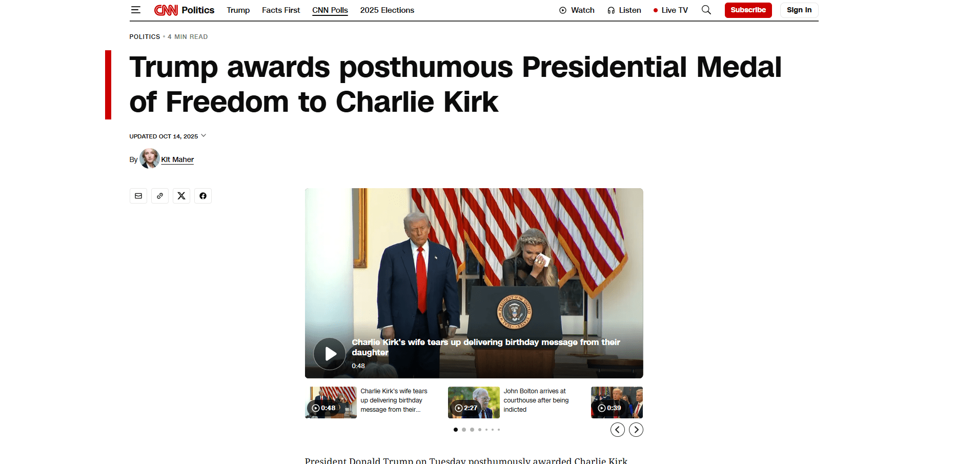 Trump awards posthumous Presidential Medal of Freedom to Charlie Kirk