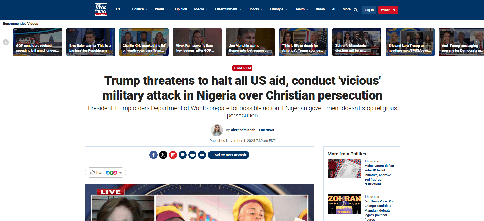 President Donald Trump threatens to stop all U.S. aid to Nigeria and warns of possible military action if the government fails to protect Christians from killings.