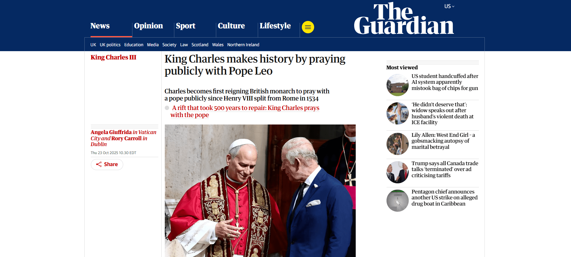 Charles becomes first reigning British monarch to pray with a pope publicly since Henry VIII split from Rome in 1534