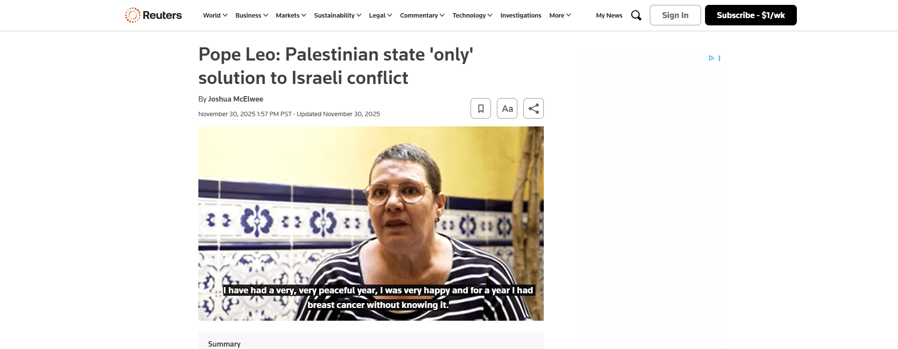 Pope Leo: Palestinian state 'only' solution to Israeli conflict