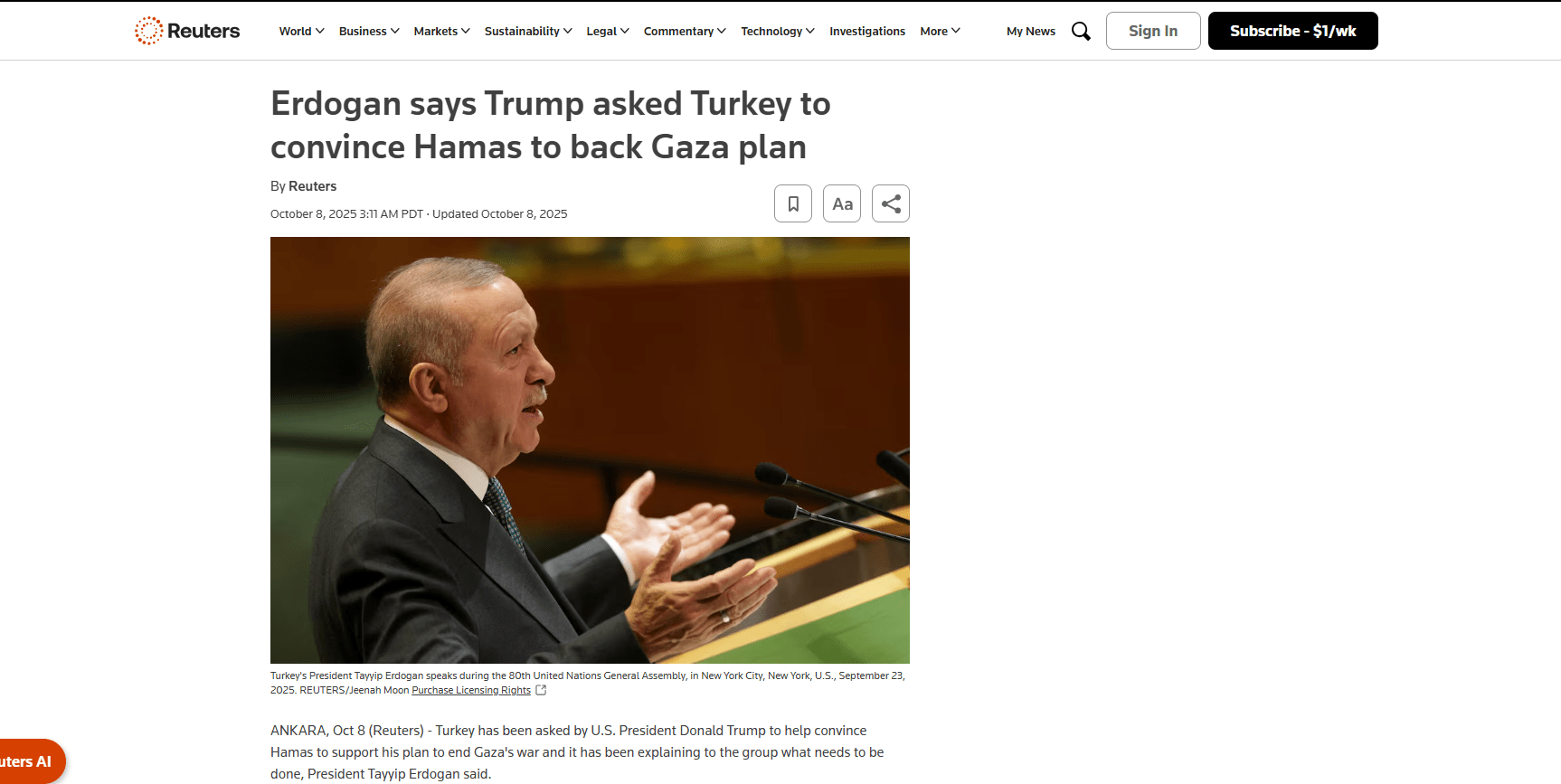 Erdogan says Trump asked Turkey to convince Hamas to back Gaza plan